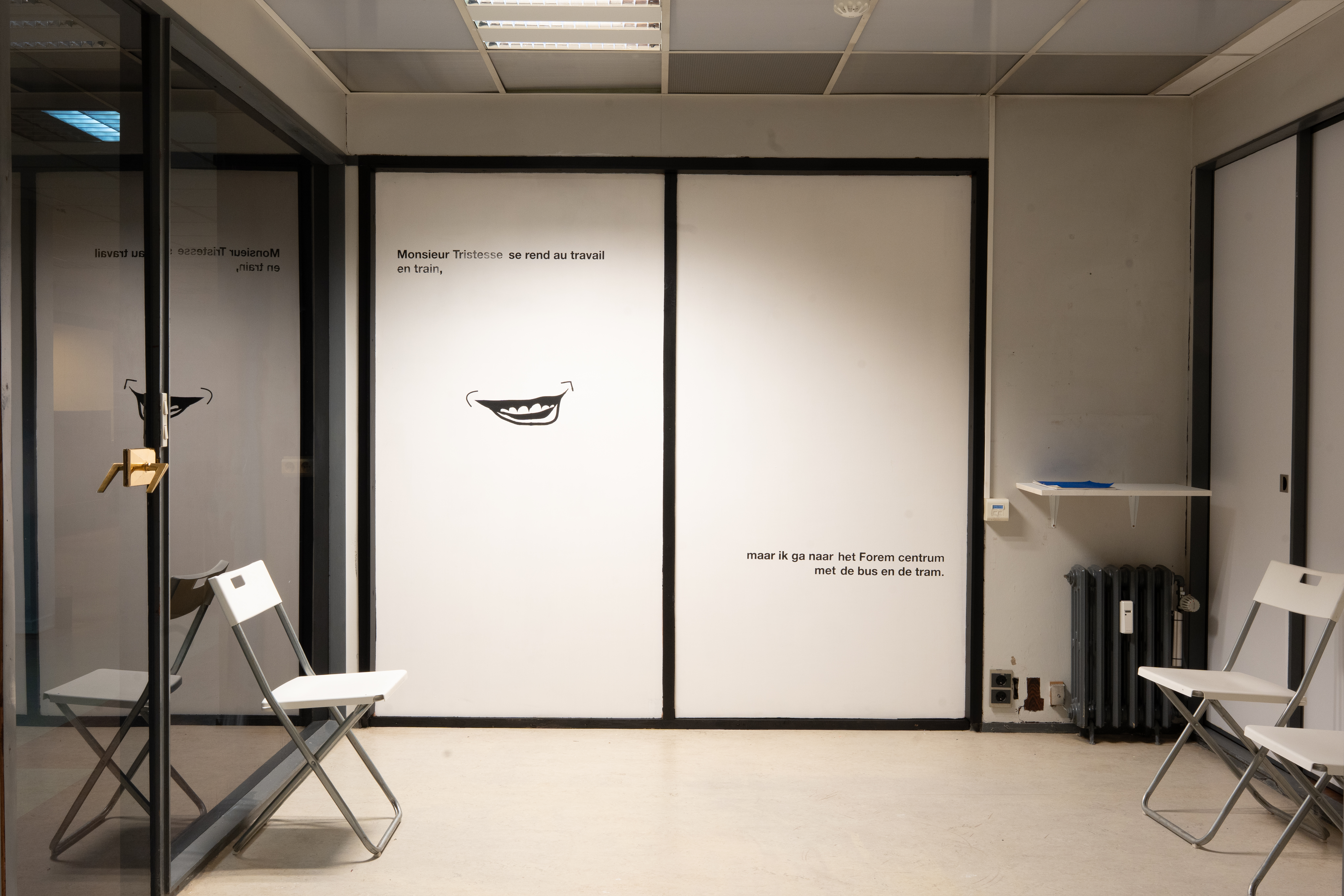 “Monsieur Tristesse en mijn collega's” combines the words of my unemployed “colleagues” in training, about their lives, how they experience unemployment, their frustrations and habits, with texts taken from our Dutch exercises, the program law on unemployment, and articles from the internet (job ads, temp agency ads, the Onem website, etc.).