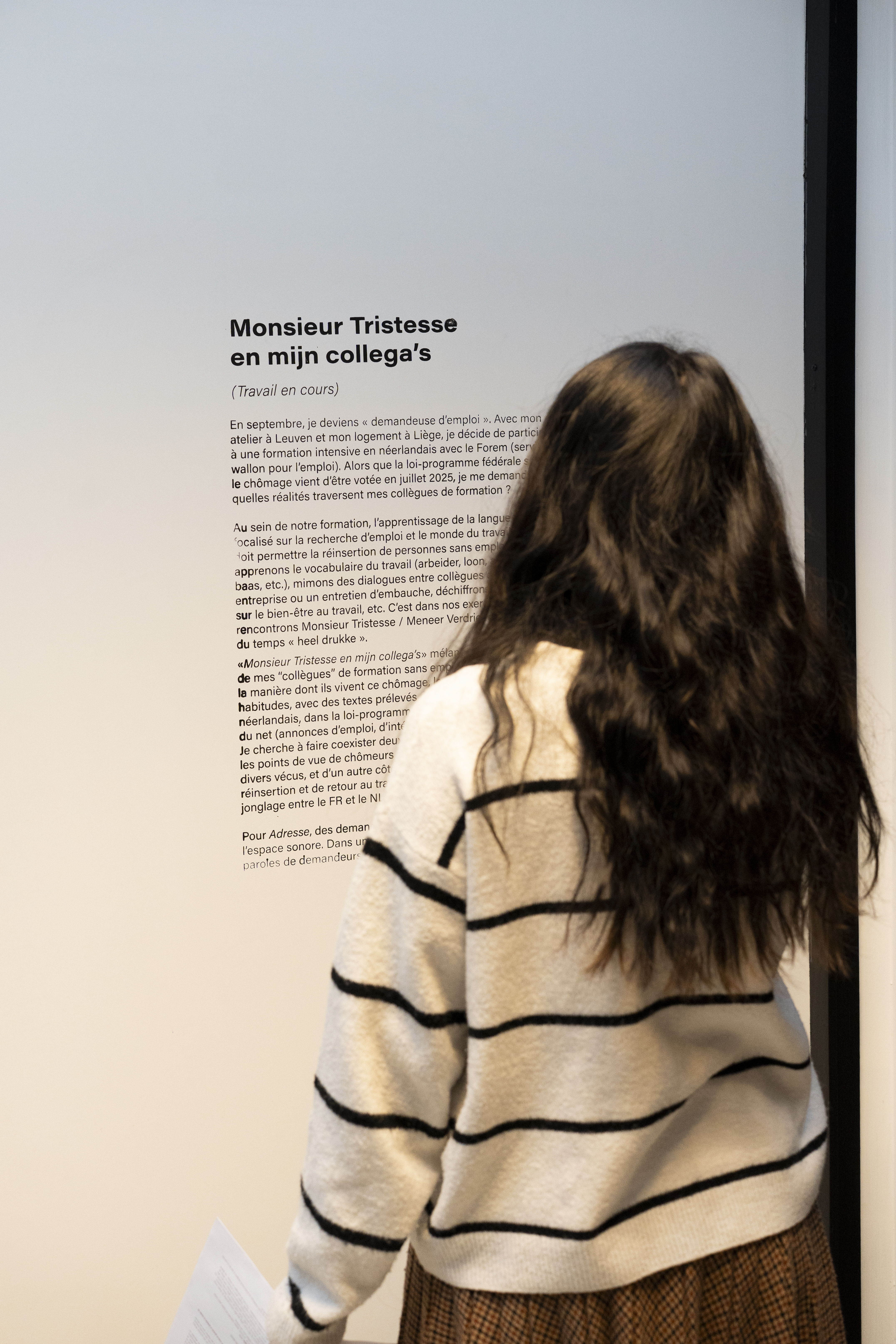 I am seeking to bring together two languages that rarely coexist: the perspectives of unemployed people through their voices and diverse experiences, and on the other hand, the injunctions and language of reintegration and return to work that are so often repeated. All this while juggling between French and Dutch.